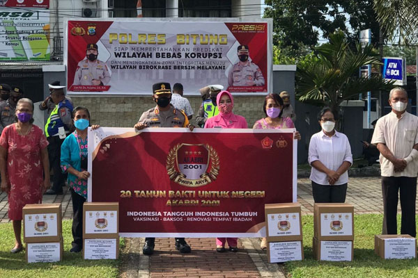 “Sebagai ungkapan syukur, kami TNI-Polri menggelar kegiatan bakti sosial, vaksinasi massal dan renovasi tempat ibadah yang dilaksanakan dibeberapa lokasi di Kota Bitung, dan giat secara serentak akan digelar pada 14 Desember di seluruh Indonesia,” ucap alumni Akabri 2001 ini.
