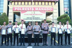 MANADO, Humas Polda Sulut – Kepolisian Resor Kota (Polresta) Manado menggelar upacara pemberian penghargaan (reward) bagi personel berprestasi dan warga sipil yang dinilai berjasa membantu tugas kepolisian.