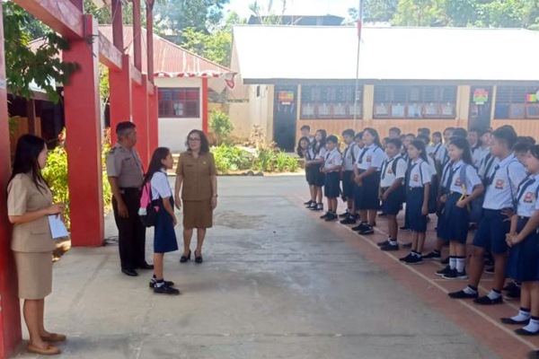 MANADO, Humas Polda Sulut– Kanit Binmas Polsek Tombulu Aiptu Agus Paulus bersama anggota Briptu Valen Undap melaksanakan kegiatan Baronang (Bhayangkara Ronda dan Sambang) di Sekolah Menengah Pertama (SMP) Kristen Kembes, Senin (12/08/2019) Pukul 12.00 Wita.