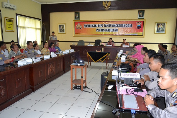 Dalam pengarahnnya Kapolres Magelang menyampaikan bahwa Sosialisasi DIPA ini di sampaikan kepada Bagian, Satuan , Kapolsek dan Fungsi, dengan di saksikan juga dari unsur Pemda , DPRD, LSM,Wartawan, Tomas dan toga, dengan maksud untuk memberikan gambaran kepada semua elemen Masyaakat dan pemerintah tentang alokasi penggunan Dana kegiatan dan Operasional Polres Magelang tahun Anggaran 2016, secara transparan tidak ada yang di tutup tutupi.