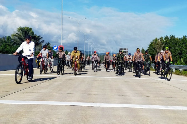 “Ini adalah Gowes Perdana Forkopimda Sulut di Jalur Tol Manado-Bitung, jaga kebersamaan dan jangan saling mendahului agar bisa tiba selamat hingga garis finish,” ujar Kapolda Sulut.