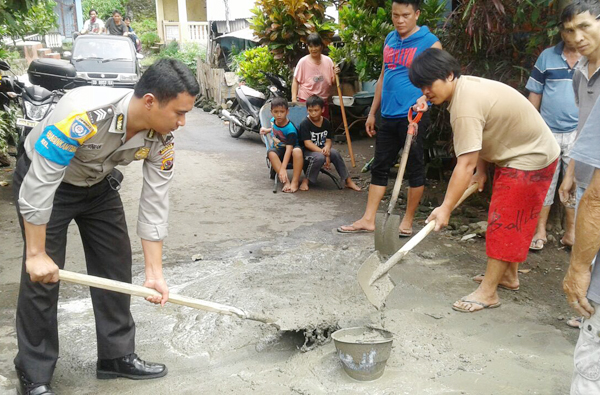 Hal tersebut dilakukan Brigpol Andri saat mengunjungi desa binaannya pagi itu. Tanpa ragu-ragu, Brigpol Andri yang berseragam dinas langsung memegang sekop dan menuangkan campuran semen, air dan pasir ke ember-ember kecil yang selanjutnya diangkat warga untuk menambal jalan yang rusak. Melihat hal ini, wargapun bertambah semangat dalam bekerja.