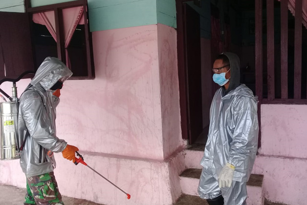 MANADO, Humas Polda Sulut – Bhabinkamtibmas Polsek Kabaruan, Brigpol Oktavianus Mapanawang menyemprotkan disinfektan dan membagikan masker di desa binaan, yakni Taduna dan Mangaran, Talaud, Senin (27/04/2020) siang.