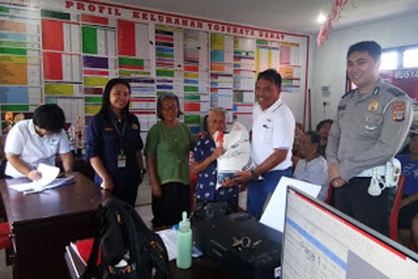 MANADO, Humas Polda Sulut – Bhabinkamtibmas Polsek Ratahan, Brigpol Sarno Pesak melaksanakan pengamanan dan pengawasan penyaluran bantuan sosial (bansos), di Keluarahan Tosuraya Barat, Kecamatan Ratahan, Kabupaten Minahasa Tenggara, Jumat (01/03/2019).