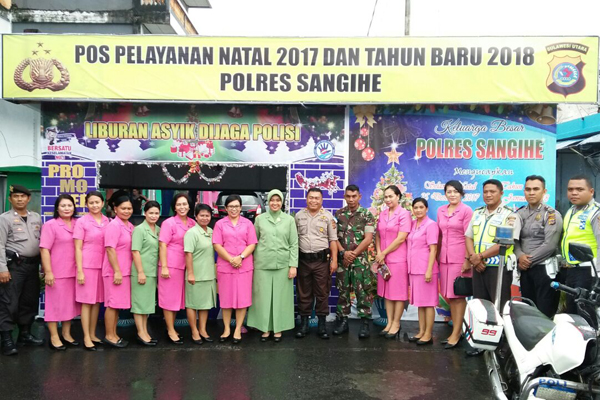 Hal tersebut, diwujudkan dengan menyambangi sejumlah pos pengamanan dan pos pelayanan yang ada di Kota Tahuna, Jum’at (29/12/2017), pagi. Kegiatan ini dipimpin oleh Ketua Bhayangkari Cabang Sangihe, Ny. Ayu Dewa Katrina dan Ketua Persit Kodim 1301/Sangihe bersama para anggota.