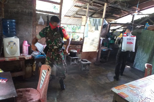 MANADO, Humas Polda Sulut – Kapolsek Tahuna, Iptu P. Aritonang memimpin penyemprotan disinfektan dan sosialisasi Maklumat Kapolri tentang Kepatuhan Terhadap Kebijakan Pemerintah dalam Penanganan Penyebaran Virus Corona (Covid-19), Kamis (02/04).