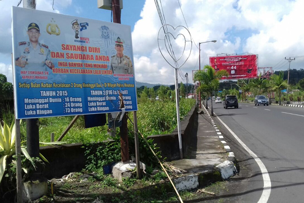 Baliho tersebut dipasang Jum’at (20/01/2017), di tiga tikungan jalan yang sering menjadi lokasi terjadinya lakalantas di wilayah hukum Polres Minahasa yakni, Puncak Kasuang, Boulevard Tondano dan Jalan Tounsea Lama arah Tanggari.