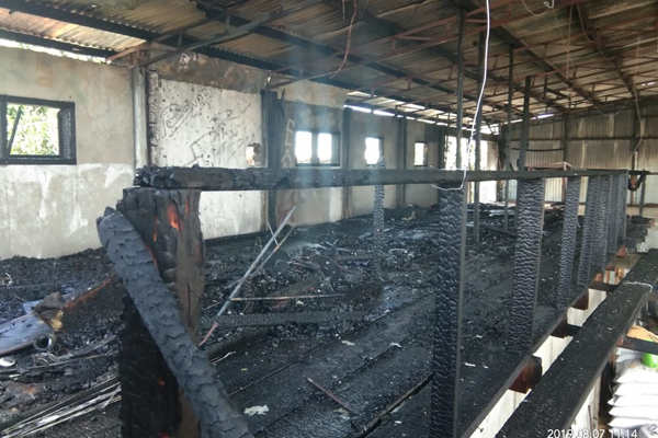 MANADO, Humas Polda Sulut – ‘Si jago merah’ mengamuk di pabrik tahu milik Pingkan Lembong yang berlokasi di Tounkuramber, Tondano, Minahasa, Rabu (07/08/2019), sekitar pukul 10.35 WITA. Mengakibatkan lima kamar di lantai dua pabrik tersebut, ludes terbakar.