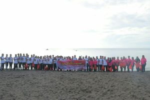 Kapolres Minut tampak membaur bersama anggota dan staf kecamatan untuk memungut sampah di sepanjang garis pantai.