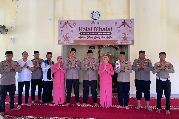 Polres Bolaang Mongondow (Bolmong) menggelar halalbihalal pasca Idulfitri 1446 Hijriah, di Masjid Abdul Rahman, Mapolres setempat, pada Senin (28/4/2025) pagi.
