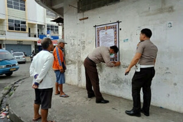 MANADO, Humas Polda Sulut – Polres Minsel terus menggencarkan kegiatan sosialisasi dan himbauan kepada masyarakat terkait dengan upaya menganitisipasi penyebaran Covid-19 atau Virus Corona. Selain dengan penyampaian himbauan langsung, dilaksanakan juga pemasangan Baliho dan menyebarkan pamflet Maklumat Kapolri.