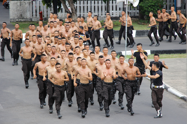 Terpantau pasukan Sabhara (Samapta Bhayangkara) yang hanya mengenakan celana dan sepatu PDL dan bertelanjang dada ini, mengitari beberapa kali halaman depan Mako Polda Sulut dan selanjutnya lari menuju keluar mako, melewati jalan protokol dan kembali lagi ke Mako Polda.