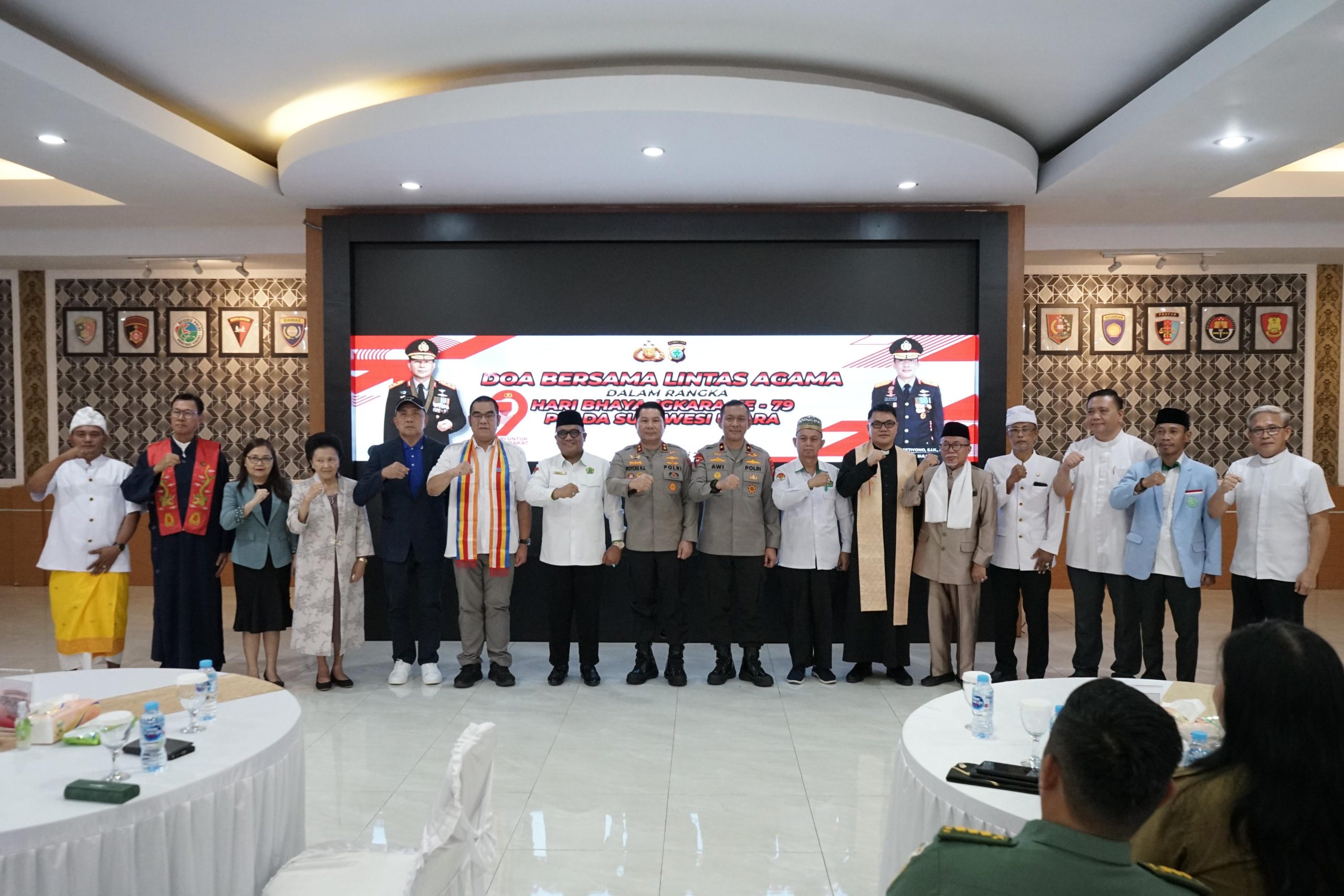 MANADO, Humas Polda Sulut – Personel Polda Sulawesi Utara bersama tokoh agama, tokoh adat dan tokoh masyarakat melaksanakan doa bersama lintas agama dalam rangka Hari Bhayangkara ke-79 tahun 2025, di aula Tribrata Polda Sulut, Senin (30/6/2025).