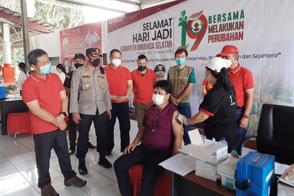 “Dalam rangka memperingati Hari Jadi Kabupaten Minsel ke-19, mendorong upaya percepatan vaksinasi guna cegah tangkal penyebaran Covid-19 dan mendukung program pemulihan ekonomi nasional,” singkat Kapolres di sela-sela kegiatan.