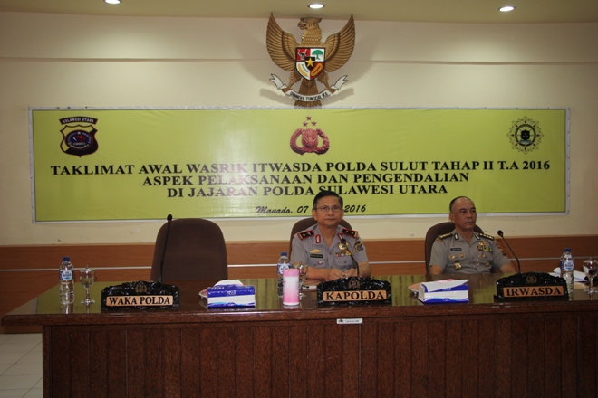 MANADO, Humas Polda Sulut – Inspektorat Pengawasan Daerah (Itwasda) Polda Sulut kembali akan mengadakan pengawasan dan pemeriksaan (wasrik) tahap II diseluruh Satuan Kerja (Satker) dan Satuan Wilayah (Satwil) jajaran. Kegiatan rutin ini didahului dengan taklimat awal yang dibuka oleh Kapolda Sulut, Irjen Pol Drs. Wilmar Marpaung, S.H., didampingi Irwasda, Kombes Pol Drs. Hotman Simatupang, S.H., Jum’at (07/10/2016), di ruang Tribrata Mapolda Sulut.