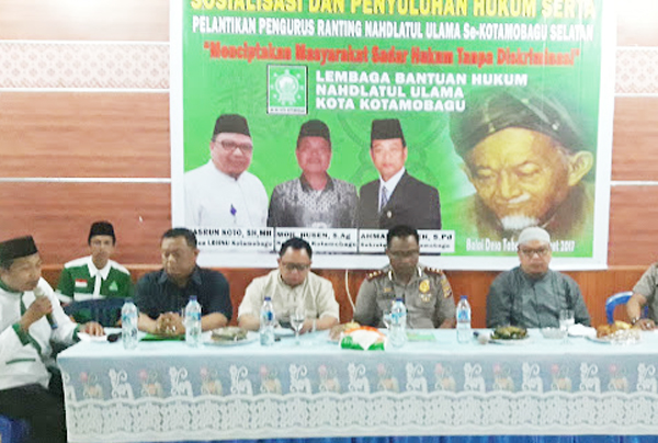 Kegiatan yang diadakan oleh Lembaga Bantuan Hukum Nahdlatul Ulama Kota Kotamobagu tersebut sekaligus dirangkaikan dengan pelantikan pengurus ranting Nahdlatul Ulama se-Kotamobagu Selatan, diikuti warga Nahdlatul Ulama beserta tokoh agama, pemuda, masyarakat dan tamu undangan lainnya.