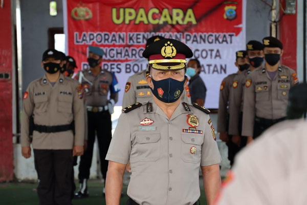 MANADO, Humas Polda Sulut – Kapolres Bolmong Selatan (Bolsel) AKBP Ketut Suryana memimpin upacara korps raport kenaikan pangkat penghargaan personel, Rabu (02/02/2022) pagi, di Mapolres setempat.