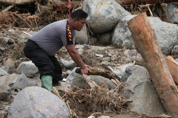 Terpantau, Kapolres dan para personel membersihkan material berupa batang pohon berukuran cukup besar yang tertumpuk di atas bebatuan sungai.