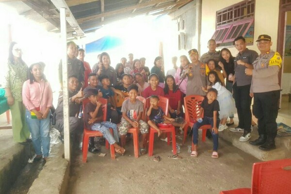 Kapolres Kepulauan Talaud AKBP Dandung Putut Wibowo bersama Ketua Cabang Bhayangkari Talaud Ny. Anastasia Putut Wibowo serta keluarga menyambangi Panti Asuhan Gloria Matahit untuk berbagi paket bingkisan di hari Natal, Senin (26/12/2022) siang.