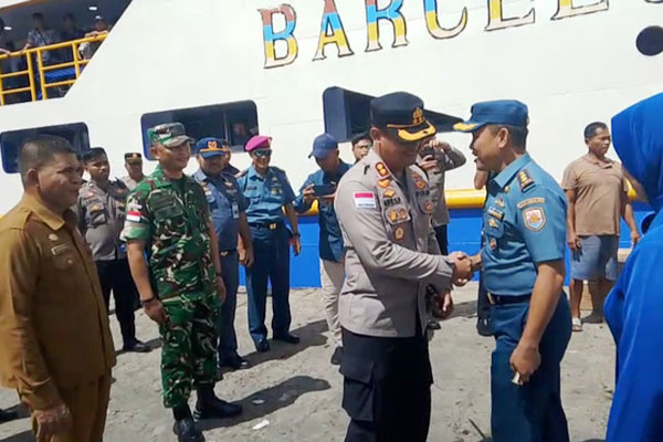 Kapolres Kepulauan Talaud AKBP Arie Sulistyo Nugroho dan Ketua Bhayangkari Cabang Kepulauan Talaud Ny. Hikma Arie Sulistyo bersama Forkopimda, menjemput kedatangan pejabat baru Danlanal Melonguane Letkol Laut (P) Yogie Kuswara, di Pelabuhan Melonguane, Selasa (29/4/2025) pagi.