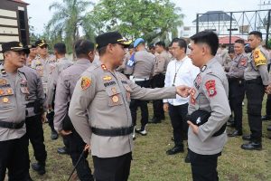 Dalam kegiatan tersebut, Kapolres didampingi oleh Wakapolres Kompol Romel MC AJ. Pontoh serta Kasi Propam Ipda Jefry Askali memeriksa satu per satu kelengkapan personel.