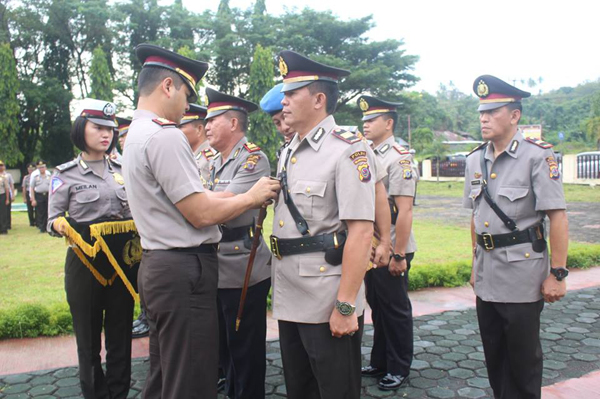 MANADO, Humas Polda Sulut – Kapolres Minahasa Selatan (Minsel), AKBP Arya Perdana pimpin upacara serah terima jabatan (sertijab) dan pengambilan sumpah jabatan Kasat Lantas, Kasat Intelkam, Kasat Reskrim, Kapolsek Touluaan dan Kapolsek Sinonsayang, Senin (13/03/2017) pagi, di halaman Mapolres.