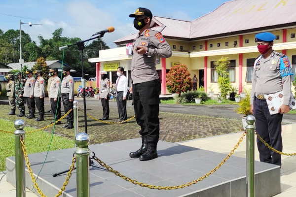 MANADO, Humas Polda Sulut – Polres Tomohon menggelar apel kesiapan dalam rangka pengamanan pelaksanaan ibadah Jumat Agung dan Paskah di wilayah hukum Polres Tomohon. Apel dipimpin oleh Kapolres Tomohon AKBP Bambang Ashari Gatot, di halaman Mapolres Tomohon, Kamis (1/4/2021).