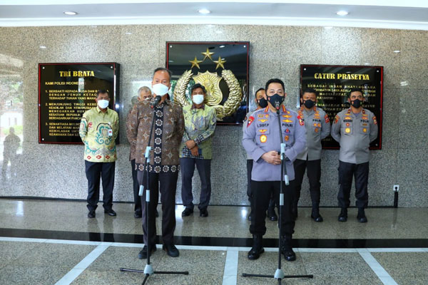 Jakarta – Kapolri Jenderal Listyo Sigit Prabowo dan Menteri Perindustrian (Menperin) Agus Gumiwang Kartasasmita menggelar rapat evaluasi terkait ketersediaan dan stabilitas harga minyak goreng, di Gedung Mabes Polri, Jakarta Selatan, Senin (4/4/2022).