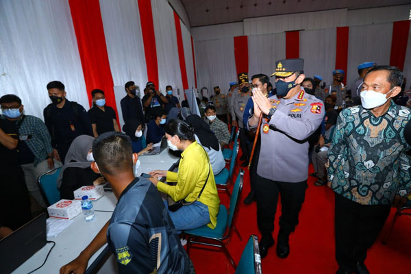 Jakarta – Kapolri Jenderal Listyo Sigit Prabowo meninjau secara langsung kegiatan akselerasi vaksinasi yang diselenggarakan bersama dengan elemen mahasiswa, BEM dan Organisasi Kepemudaan (OKP) di Gelanggang Olahraga Universitas Trisakti, Jakarta, Selasa (29/3/2022).