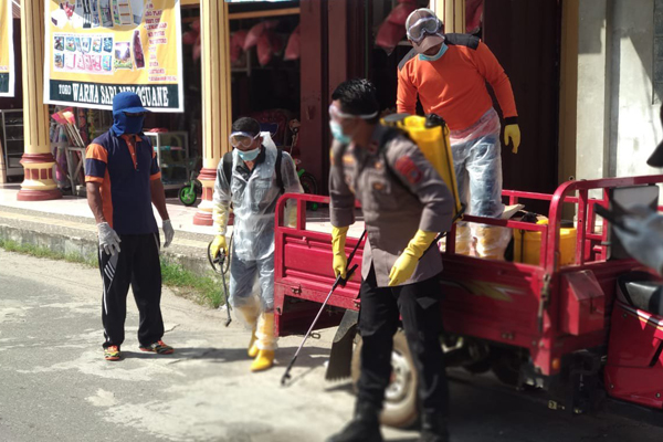 MANADO, Humas Polda Sulut – Kapolsek Melonguane Ipda Dedy Matahari, SH bersama personil dan Tim Penanggulangan Covid-19 melaksanakan penyemprotan disinfektan di sejumlah tempat, Rabu (8/4/2020) pagi.