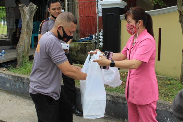 Bantuan diserahkan secara simbolis oleh Ny. Mila Mulyatno kepada Kapolres Kotamobagu AKBP Irham Halid. Adapun bantuan yang diberikan berupa makanan ringan dan makanan siap santap dalam kemasan dos, serta minuman.