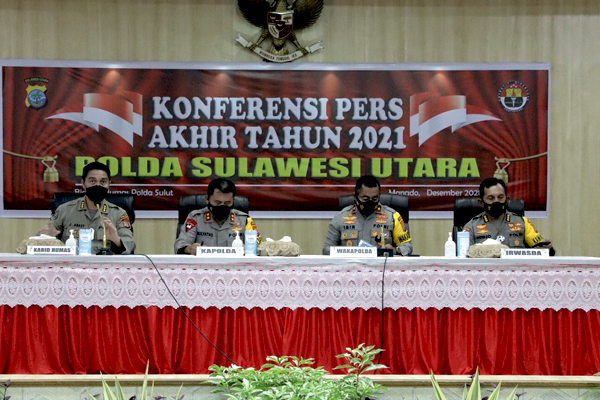 Hal tersebut disampaikan Kapolda Sulawesi Utara Irjen Pol Mulyatno saat memimpin Konferensi Pers Akhir Tahun 2021, yang digelar di aula Catur Prasetya Polda Sulut, Kamis (30/12/2021), yang dihadiri oleh Wakapolda Sulut Brigjen Pol Johnny Eddizon Isir, para PJU dan wartawan pos liputan Polda.