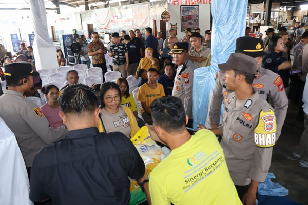 Usai mengikuti video conference launching, Kapolda Sulut menyerahkan bantuan pangan kepada warga masyarakat dan meninjau pelaksanaan Gerakan Pangan Murah Polri, yang dilakukan melalui penjualan beras SPHP kepada warga masyarakat.