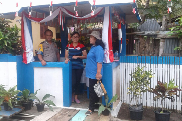 MANADO, Humas Polda Sulut – Bhabinkamtibmas Kelurahan Tandurusa Polres Bitung, Aipda Tommy Toar bersama Ketua Tim Penggerak PKK kelurahan setempat, Pdt. Melinda Natarang, S.Th., dan Kasi Pemerintahan, Gustin Pudi melakukan penilaian lomba antar lingkungan, Kamis (17/08/2017), siang.