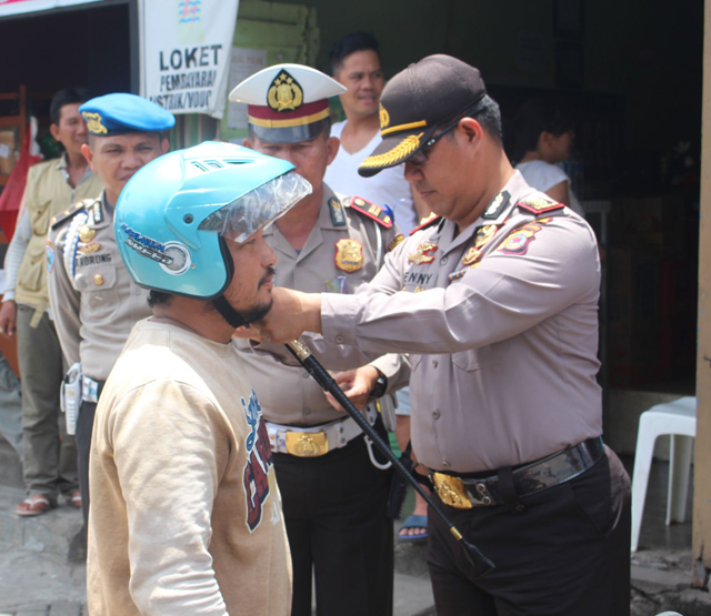 MANADO, Humas Polda Sulut – Polres Minahasa Selatan (Minsel) bagikan helm dan bunga kepada pengendara sepeda motor di Pusat Kota Amurang, tepatnya di pertigaan lampu merah BRI dan di depan Sakura Mart, Senin (21/03/2016). Sedikitnya 100 helm SNI dibagikan secara gratis kepada pengendara yang tidak menggunakan pengaman kepala ketika berkendara. Kegiatan ini dipimpin langsung oleh Kapolres Minsel AKBP Benny Bawensel, SIK, MH, sekaligus menandai berakhirnya pelaksanaan Operasi Simpatik 2016.