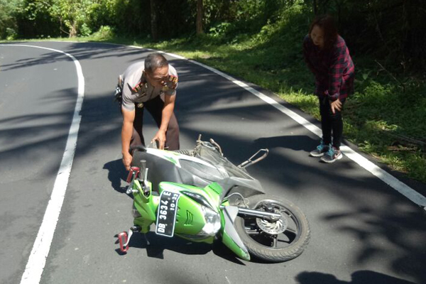 MANADO, Humas Polda Sulut – Nasib apes dialami seorang ibu rumah tangga (IRT) bernama Diane Sumangkut (42). Perempuan asal Motoling, Minahasa Selatan ini mengalami kecelakaan tunggal di ruas jalan Desa Lansot, tepatnya di perbatasan antara Kecamatan Kawangkoan dan Kecamatan Tareran, Rabu (20/12/2017) siang.