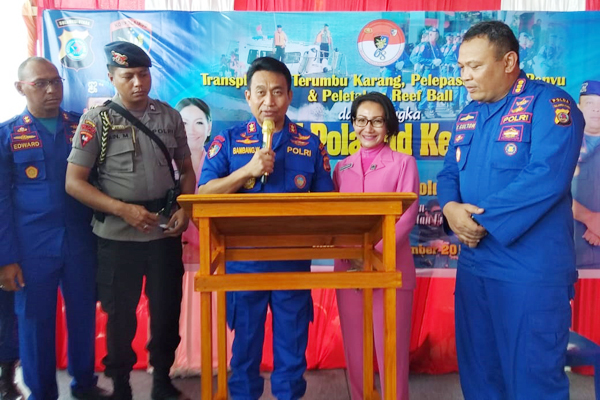 MANADO, Humas Polda Sulut – Polda Sulawesi Utara melalui Direktorat Polairud, bekerja sama dengan Bhayangkari dan Fakultas Perikanan dan Ilmu Kelautan Unsrat Manado, menggelar kegiatan pelestarian alam berupa transplantasi terumbu karang, pelepasan tukik penyu dan peletakan reef ball, di Pantai Malalayang Manado, Kamis (29/11/2018).