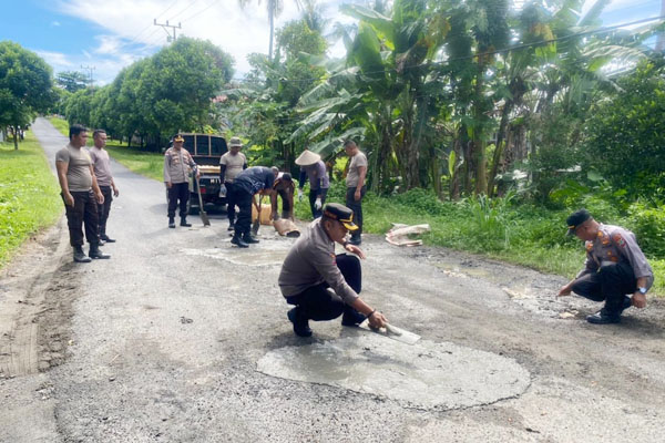Kegiatan penambalan jalan berlubang ini diinisiasi oleh Kasat Binmas Polres Kepulauan Talaud AKP Jacobus Melale melalui salah satu program kreatif.