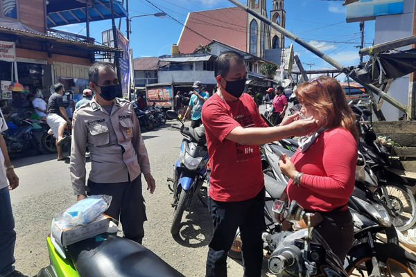 Masker dibagikan langsung oleh Camat Tareran Hiskia Kondoj dan Bhabinkamtibmas Polsek Tareran Bripka Domianus Tandungan, di sekitar Pasar 45 Lansot, Tareran, Minahasa Selatan.