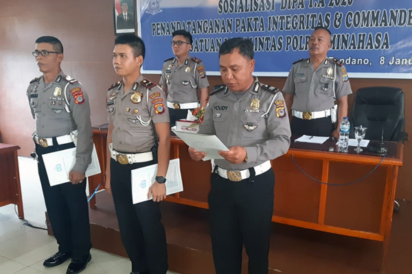 MANADO, Humas Polda Sulut – Memasuki tahun 2020, Satuan Lalulintas Polres Minahasa menggelar penandatanganan Pakta Integritas di ruang Maesa Polres Minahasa, Rabu (8/1) pukul 10.00 wita.