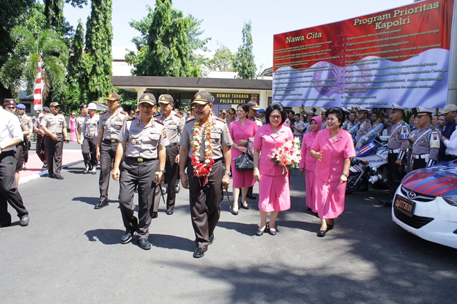 MANADO, Humas Polda Sulut – Diiringi tarian Kabasaran, Kapolri Jenderal Polisi Drs. Badrodin Haiti bersama rombongan memasuki halaman Mako Polda Sulut, Jumat (20/5/2016). Seluruh personil Polda Sulut yang dipimpin Kapolda Brigjen Pol Drs. Wilmar Marpaung menyambut kedatangan Kapolri yang didampingi Kabaharkam Polri, As SDM Polri, As Rena Polri dan Ketua Umum Bhayangkari.