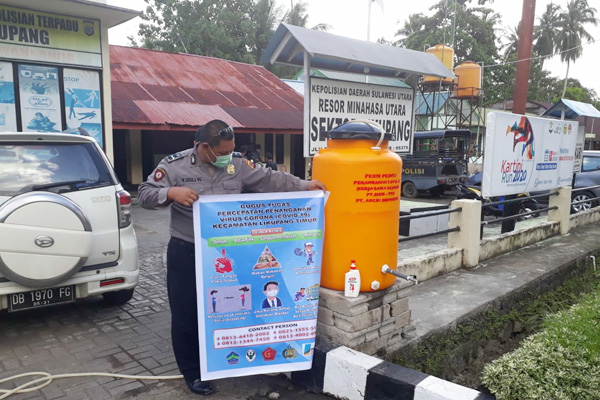 MANADO, Humas Polda Sulut – Jadikan Polsek Likupang sebagai garda terdepan dalam mencegah penyebaran virus corona, Polsek Likupang lakukan pemasangan tong cuci tangan di depan Mapolsek Likupang.
