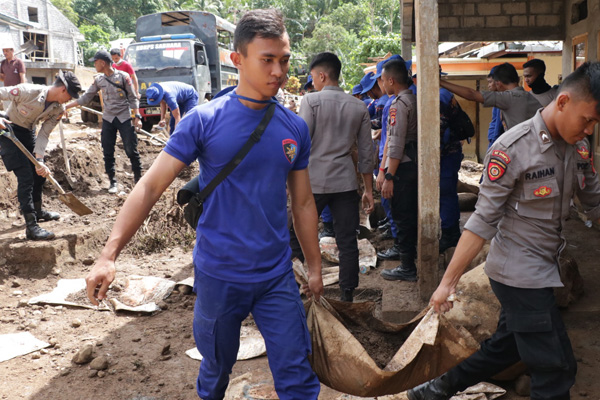 Terpantau, para personel membersihkan sisa-sisa lumpur dan pasir yang mulai mengering, termasuk mengangkat material di antaranya berupa bebatuan dan batang kayu yang terbawa arus saat kejadian, Jum’at (03/01) lalu.