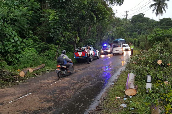 MANADO, Humas Polda Sulut – Tanah longsor dan pohon tumbang terjadi disejumlah lokasi di ruas Jalan Trans Sulawesi wilayah Minahasa Selatan (Minsel), Minggu (08/01/2017) sore. Hal ini disebabkan tingginya curah hujan disertai angin kencang yang melanda wilayah tersebut sejak Minggu siang. Tak ayal, musibah ini mengakibatkan kemacetan lalulintas yang cukup panjang.