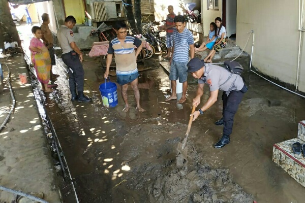 Personil Polairud bersama masyarakat, Babinsa dan pemerintah setempat, bahu membahu melaksanakan pembersihan rumah-rumah warga yang terkena banjir disertai lumpur.