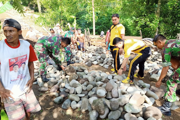 Terpantau puluhan personil Polsek dan Koramil Kendahe terlibat langsung membantu pengerjaan pengecoran dinding penahan (talud).