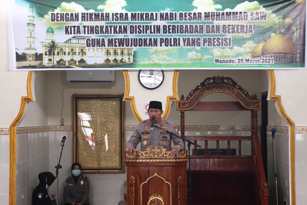 Peringatan Isra Miraj digelar di Masjid Nurul Jihad Polda Sulut, Kamis (25/3/2021), dengan mengangkat tema ‘Dengan Hikmah Isra Miraj Nabi Besar Muhammad SAW, Kita Tingkatkan Disiplin Beribadah dan Bekerja Guna Mewujudkan Polri yang Presisi’.