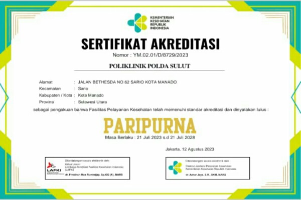 “Alhamdulillah, hasil akreditasi Poliklinik Polda Sulut dinyatakan lulus dengan paripurna. Ini pengalaman pertama akreditasi di Polda Sulut. Semoga Poliklinik milik jajaran Polda Sulut lainnya bisa menyusul,” ucapnya.