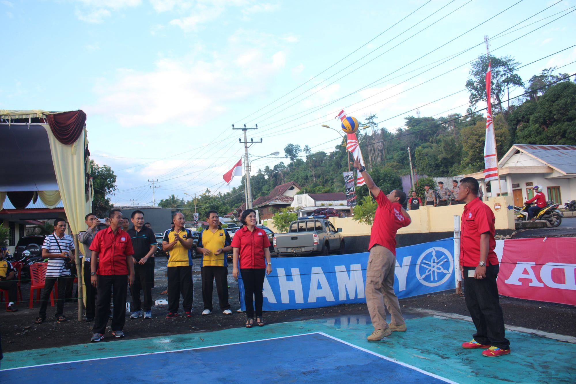 Pembukaan Turnamen Bola Voli ditandai dengan service pertama yang dilakukan oleh Kapolres Minsel yang disambut dengan tepuk tangan meriah dari ratusan penonton yang memadati lokasi pertandingan ini.