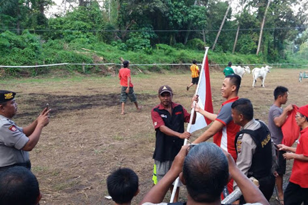 MANADO, Humas Polda Sulut – Personil Polsek Kauditan melaksanakan pengamanan lomba karapan sapi dalam rangka HUT Kabupaten Minahasa Utara (Minut) ke-14, Desa Watudambo Kecamatan Kauditan Kabupaten Minut,